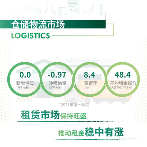 第一季度市場無新增供應(yīng),逾75%的項(xiàng)目目前滿租,租賃交易整體以續(xù)租為主。但第三方物流和電商新租交易仍然活躍,大型租賃交易包括安能物流在松江新租1.8萬平方米,以及國內(nèi)知名生活服務(wù)電商平臺在金山租賃超過1萬平方米。社區(qū)團(tuán)購和醫(yī)藥物流加速發(fā)展推動冷庫需求持續(xù)增長,北京亞冷分別在在嘉定與松江擴(kuò)租合計5萬平方米。季末,受奉賢某租戶遷至自建倉的影響,整體空置率環(huán)比上升0.2百分點(diǎn)至8.4%。平均租金環(huán)比上升1.1%至每月每平方米48.4元。