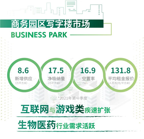 2021年第一季度,上海商務(wù)園區(qū)寫字樓市場迎來兩個新項(xiàng)目入市,分別是張江華大半導(dǎo)體園區(qū)與市北西岸壹號,共計85,560平方米,預(yù)租率為30%左右。在錄得新增供應(yīng)的情況下,整體市場空置率下行1.0個百分點(diǎn)至16.9%,凈吸納量達(dá)175,015平方米,市場活躍程度優(yōu)于往年同期水平。