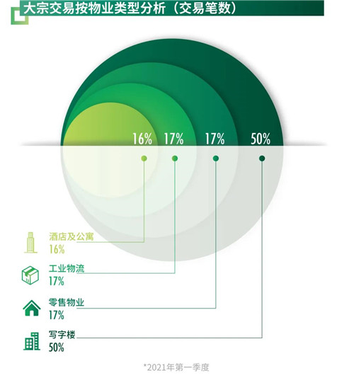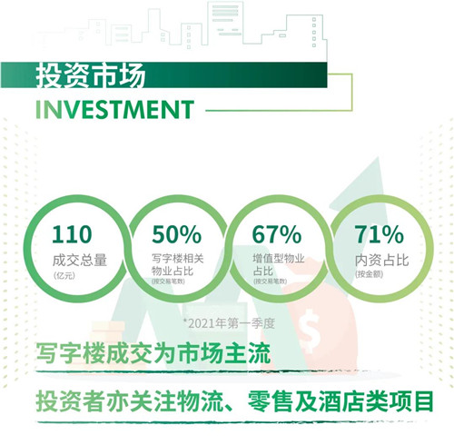 2021年第一季度,上海大宗交易市場錄得了12筆大宗交易共計110億元人民幣的交易額。其中以投資為目的的投資交易額達(dá)人民幣69.2億元,同比增長21.6%并占到交易總額的62.9%。從投資交易的筆數(shù)的占比成分分析,核心增值型投資策略為目前市場主流,占到了67%的比例。綜合上述的現(xiàn)象,我們認(rèn)為如年初調(diào)查結(jié)果一樣,投資者整體購買意向正轉(zhuǎn)為積極,但在標(biāo)的選取更加注重現(xiàn)金流的穩(wěn)定性。