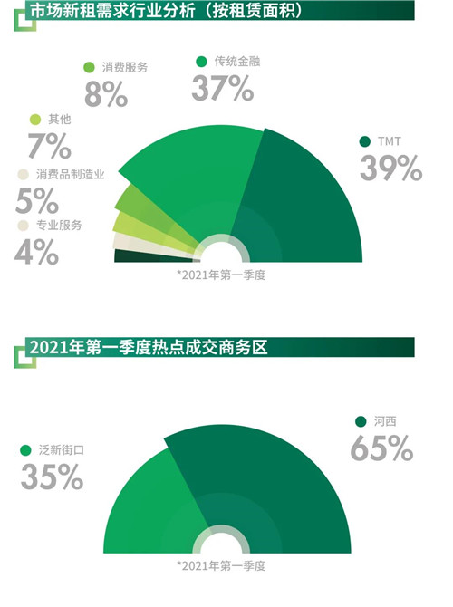 本季度凈吸納量環(huán)比大幅增長(zhǎng)至20,879平方米。TMT產(chǎn)業(yè)的租賃成交占到了整體的38.6%,為優(yōu)質(zhì)寫字樓市場(chǎng)最活躍的租戶之一。另外,銀行、證券、信托及基金公司等金融租戶持續(xù)進(jìn)行布點(diǎn),租賃交易面積占比達(dá)全市的37.0%。商業(yè)和交通配套持續(xù)升級(jí)的河西板塊仍是租戶選址熱點(diǎn),本季度在全市租賃交易面積中的占比達(dá)到64.9%。