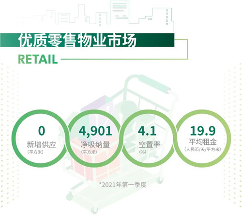 2021年第一季度南京零售市場(chǎng)未錄得新增供應(yīng),空置率下降了0.2個(gè)百分點(diǎn)至4.1%。