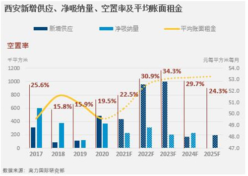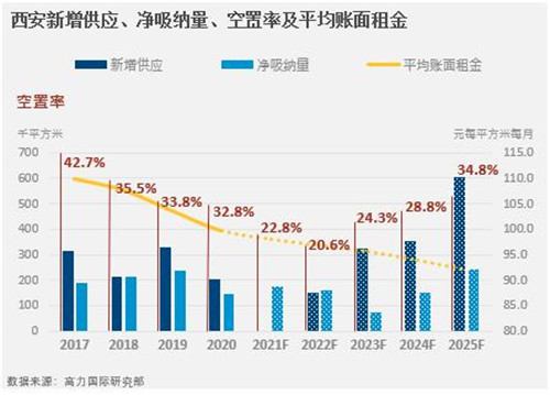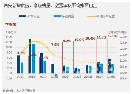受部分項目開發(fā)交付節(jié)點影響,高力國際認為2021年仍是西安甲級寫字樓“去庫存”的一年,伴隨著市場需求的持續(xù)回暖,預計未來一年市場平均空置率將有較大幅度的下降。而自2022年起,市場將逐漸進入供應放量的通道,雖市場需求仍將保持相對穩(wěn)定,但大量優(yōu)質(zhì)項目的入市將加速老舊項目以價換量的情況,致使租金仍將處于下行通道,降幅也將隨著供應的放量而放寬。