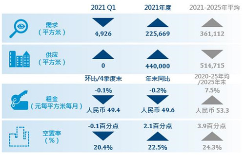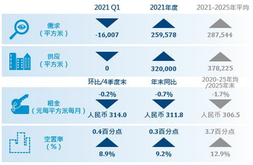本季度西安甲級寫字樓市場未錄得新增供應。截至2021年第一季度,西安甲級寫字樓總存量與2020年第四季度持平,共約176.6萬平方米。