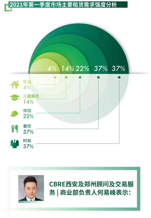 本季度整體甲級寫字樓市場一改往常第一季度的平靜,表現(xiàn)較為活躍。分需求行業(yè)來看,TMT、房地產及建筑業(yè)和金融業(yè)的占比繼續(xù)增長,分別占新增租賃需求的21%,17.4%,14.4%。2020年西安研發(fā)投入強度5.17%,技術市場合同成交額累計達到5,600億元,均位居全國副省級城市第一。硬科技在為西安現(xiàn)代產業(yè)發(fā)展提供硬支撐的同時亦推動TMT企業(yè)成為寫字樓核心需求來源。與此同時,隨著甲級寫字樓中在線教育類租戶的飽和,部分業(yè)主對于在線教育類勞動密集型企業(yè)采取謹慎態(tài)度,加之租金預期的轉變,導致上年度對甲級寫字樓需求強勁的在線教育品牌轉向產業(yè)園市場。