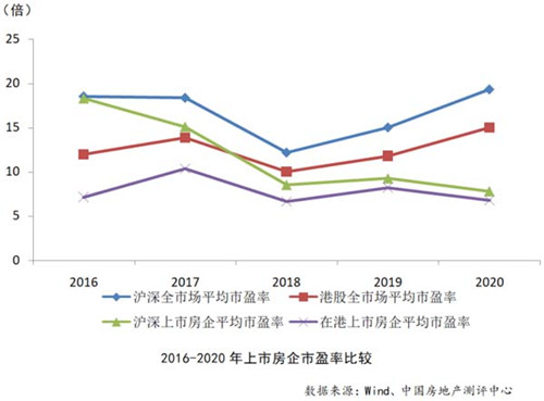 在資本市場表現(xiàn)上,企業(yè)估值持續(xù)下探。報告顯示,2020年末滬深上市房企平均市盈率7.78倍,較滬深全市場平均市盈率低約60%;在港上市房企平均市盈率6.79倍,較港股全市場平均市盈率低約55%;市凈率方面,滬深上市房企平均市凈率同樣遠(yuǎn)低于全市場水平,在港上市房企平均市凈率表現(xiàn)較好,高于港股全市場平均市凈率。
