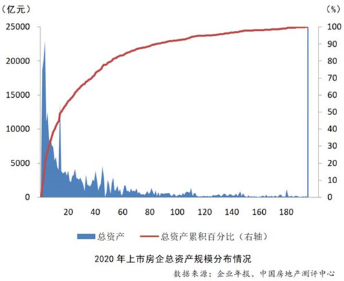 從上市房企總資產(chǎn)規(guī)模來看,截至2020年末總資產(chǎn)超過千億的上市房企有59家,約占上市房企總量的30%,其中超過3000億的上市房企有27家,約占上市房企總量的14%。超過萬億的上市房企共有6家,分別是恒大、碧桂園、萬科、綠地、保利、融創(chuàng)。從總資產(chǎn)累積百分比來看,10強(qiáng)上市房企的總資產(chǎn)累積百分比已超過40%,50強(qiáng)累積百分比近80%,100強(qiáng)累積百分比超90%,集中度較上年略有上升。