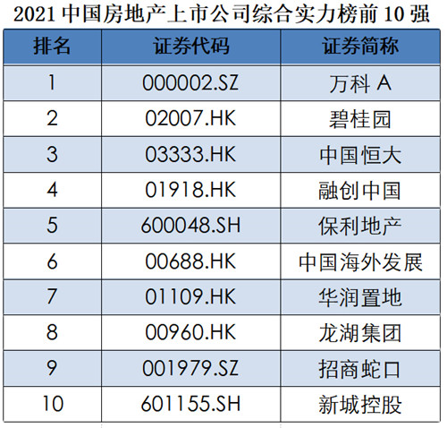 根據(jù)《2021中國房地產(chǎn)上市公司測評研究報告》顯示,10強(qiáng)上市房企整體沒有太大變化。其中,萬科繼續(xù)位列第一,碧桂園排名提升一位,位列第二,恒大、融創(chuàng)、保利、中海分別位列第三、第四、第五、第六,華潤置地、龍湖集團(tuán)排名與上年一致,分別位列第七、第八;招商蛇口排名提升三位,位列第九,首次躋身前十;新城控股位列第十位。