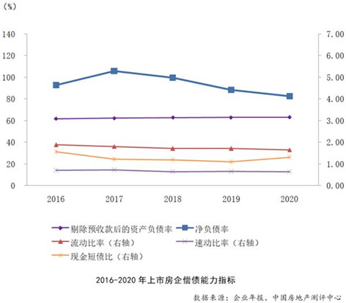 根據(jù)報告,長期償債能力方面,2020年上市房企剔除預(yù)收賬款后的資產(chǎn)負(fù)債率均值為62.93%,與上年相比保持穩(wěn)定;凈負(fù)債率均值為95.07%,較上年下降5.75個百分點(diǎn)。在“三道紅線”的監(jiān)管壓力下,房企紛紛采取多種方式降杠桿,凈負(fù)債率在短期內(nèi)的調(diào)整幅度相對較大。短期償債能力方面,流動比率均值為1.65,速動比率均值為0.64,兩者與上年相比,均基本保持穩(wěn)定,F(xiàn)金短債比中位數(shù)為1.30,較上年提升0.21個百分點(diǎn),上市房企貨幣資金對短期債務(wù)的覆蓋情況有所改善,短期償債能力提升。