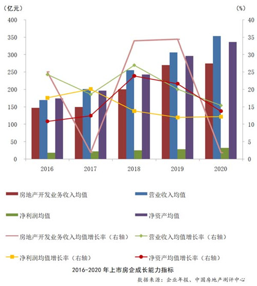 在成長能力上,上市房企業(yè)績增速整體放緩。2020年,上市房企的房地產(chǎn)開發(fā)業(yè)務(wù)收入、營業(yè)收入、凈利潤和凈資產(chǎn)規(guī)模均實(shí)現(xiàn)增長,除凈利潤外,增速均有所下滑。具體來看,房地產(chǎn)開發(fā)業(yè)務(wù)收入均值同比增長1.84%,增速較上年大幅下降32.55個百分點(diǎn);營業(yè)收入均值同比增長15.40%,增速較上年下降4.64個百分點(diǎn);凈利潤均值同比增長12.17%,增速較上年上升0.05個百分點(diǎn);凈資產(chǎn)規(guī)模均值同比增長13.75%,增速較上年下降8.22個百分點(diǎn)。