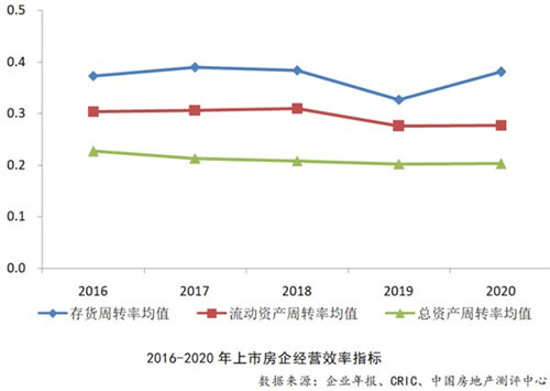 在經(jīng)營效率方面,運(yùn)營效率穩(wěn)中有升,存貨規(guī)模增速下降。2020年上市房企經(jīng)營效率穩(wěn)中有升,存貨周轉(zhuǎn)率、流動資產(chǎn)周轉(zhuǎn)率和總資產(chǎn)周轉(zhuǎn)率均值分別為0.38、0.28和0.20。其中,存貨周轉(zhuǎn)率均值較2019年上升0.05,其余兩項(xiàng)指標(biāo)與2019年基本持平。報告指出,在“三道紅線”和“兩集中”等強(qiáng)監(jiān)管環(huán)境下,上市房企存貨規(guī)模增速變緩。2020年存貨同比增長14.80%,增速較2019年下降7.80個百分點(diǎn)。其中63家房企2020年存貨同比減少,2019年為49家。從存貨集中度情況看,10強(qiáng)上市房企總存貨占比約42%,30強(qiáng)房企占比約67%,50強(qiáng)房企占比約81%。