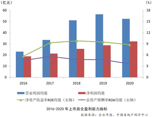 盈利能力方面,多數(shù)指標(biāo)有所下滑。報告顯示,2020年上市房企營業(yè)利潤均值52.47億元,同比下降7.15%;凈利潤均值32.17億元,同比增長12.17%;凈資產(chǎn)收益率均值8.78%,同比下降7.60%;總資產(chǎn)報酬率均值3.62%,同比下降23.66%。除凈利潤均值外,其余各項(xiàng)盈利能力指標(biāo)均較上年有不同程度的下滑。