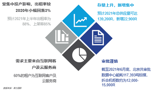 北京作為京津冀數(shù)據(jù)中心市場的核心區(qū)域,市場交易活躍,需求持續(xù)旺盛。經(jīng)統(tǒng)計分析,北京數(shù)據(jù)中心市場60%左右的租戶為互聯(lián)網(wǎng)客戶及云服務(wù)商。但北京數(shù)據(jù)中心市場監(jiān)管嚴格,項目審批謹慎,2021年上半年北京共審批數(shù)據(jù)中心能耗117,393噸標煤,折合機柜數(shù)約為12,000-15,000R。