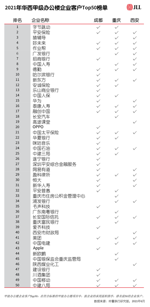 基于對西部辦公樓市場逾十年的數(shù)據(jù)追蹤,仲量聯(lián)行已連續(xù)多年以城市維度發(fā)布Top50系列報告。本次報告系仲量聯(lián)行首次以區(qū)域維度,對華西甲級辦公樓中的企業(yè)客戶Top50進行排行統(tǒng)計。