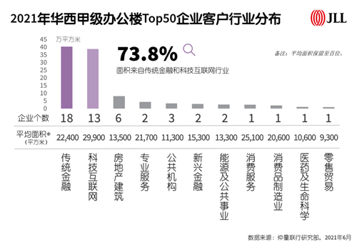 從產(chǎn)業(yè)維度來看,Top50榜單中,傳統(tǒng)金融與科技互聯(lián)網(wǎng)以73.8%的占比成為華西甲級辦公樓中頭部企業(yè)絕對行業(yè)代表,與其他產(chǎn)業(yè)差距逐步拉大。