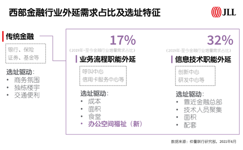 近年來越來越多的金融產(chǎn)業(yè)加速進軍內(nèi)陸市場。從早年的呼叫中心、客服中心到今日西部多地的創(chuàng)新中心、研發(fā)中心等多元后臺職能部門,金融企業(yè)對辦公空間的要求及布局愈加具象與多元。2019年至今,西部共錄得該類新增優(yōu)質(zhì)辦公需求近10萬平方米。而隨著金融行業(yè)不同的職能外延,不同類型金融企業(yè)在選址時的差異化特征亦不斷顯現(xiàn)。