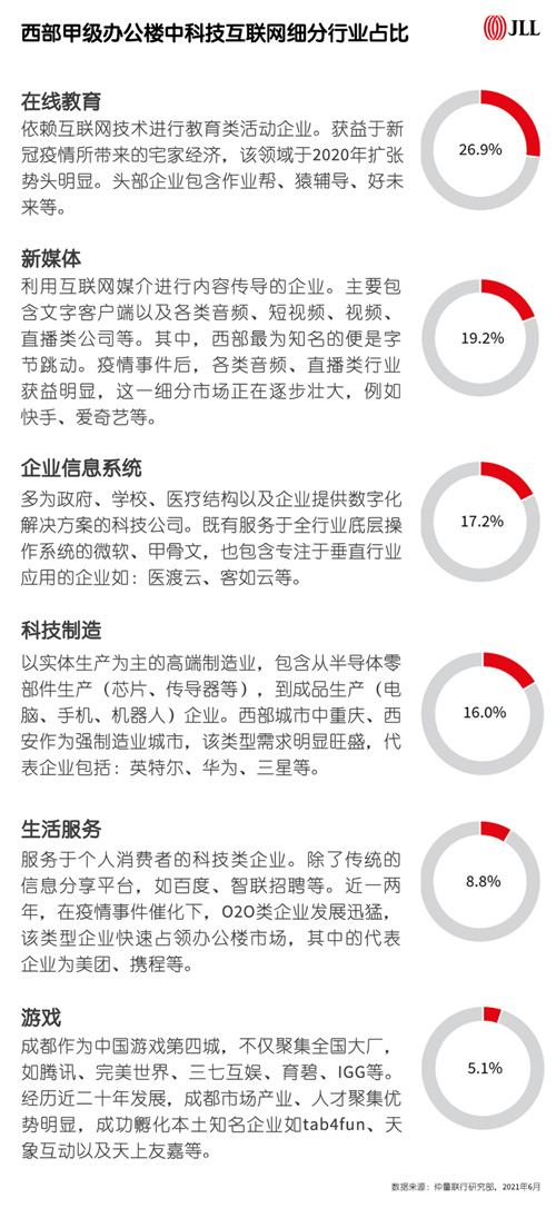值得關(guān)注的是,由于產(chǎn)品服務(wù)高速迭代,市場玩家結(jié)構(gòu)頻繁發(fā)生變化。對辦公樓租賃市場而言,互聯(lián)網(wǎng)科技行業(yè)的多元性和復(fù)雜性遠高于其他,僅從單一整體維度進行畫像已無法滿足當前市場情況。本次報告中,仲量聯(lián)行創(chuàng)新地將科技互聯(lián)網(wǎng)企業(yè)進行了細分,并計算出華西甲級辦公樓中科技互聯(lián)網(wǎng)六大細分領(lǐng)域的租賃面積占比——在線教育(26.9%)、新媒體(19.2%)、企業(yè)信息系統(tǒng)(17.2%)、科技制造(16.0%)、生活服務(wù)(8.8%)以及游戲(5.1%)。
