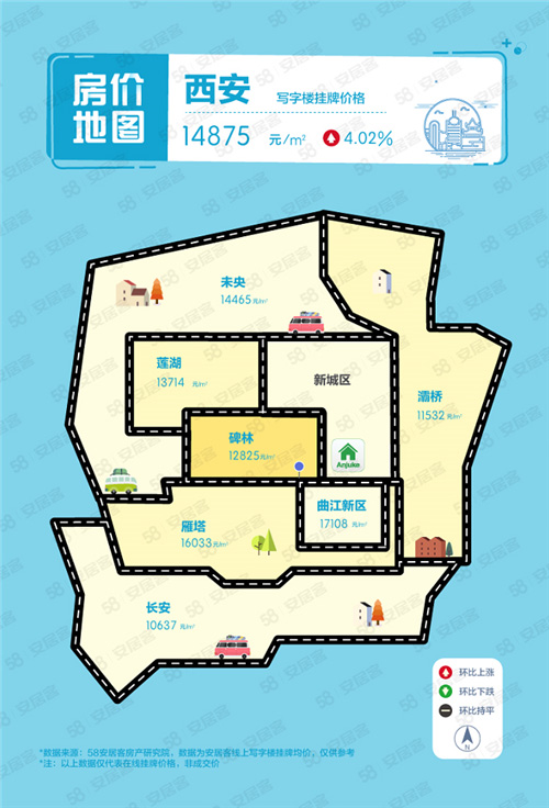 二季度西安寫字樓掛牌價格為14875元/㎡,環(huán)比上漲4.02%。分區(qū)域來看,曲江新區(qū)以17108元/㎡的掛牌價格排名靠前,雁塔區(qū)以16033元/㎡的水平排在其后。