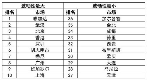 武漢市位居第二位,原因是2010年至2013年租金大漲,三年內(nèi)租金幾乎增長了100%, 在最后的兩年租金有所下降。北京位列第三位,租金呈現(xiàn)了類似的增長軌跡,但平均波動性較低。