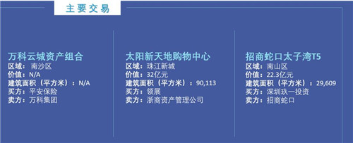 深圳方面,平安保險收購萬科云城商業(yè)組合100%股權。深圳國際集團以 15.6 億元收購23,800平方米寫字樓自用,CDL收購某商業(yè)園區(qū)55%股權,招商蛇口以22.3億元將南山太子灣近30,000平方米寫字樓出售給某國內(nèi)投資者。