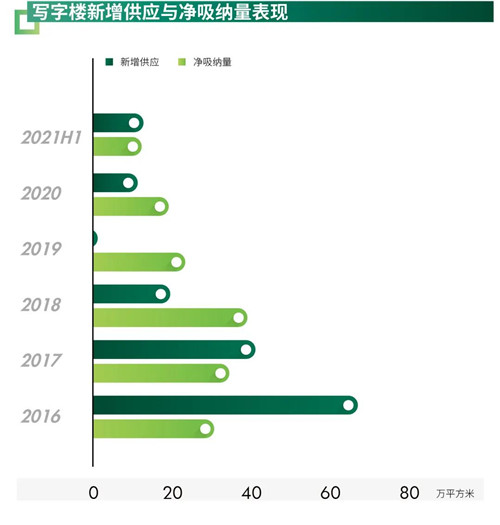 2021上半年,重慶優(yōu)質(zhì)寫字樓市場供應(yīng)回升,迎來兩個甲級寫字樓合計約12.9萬平方米的新增供應(yīng)面積,分別是位于照母山的光環(huán)中心和位于解放碑的復(fù)星國際中心。著眼需求端,受線上行業(yè)調(diào)整影響,需求于第二季度略有放緩,上半年凈吸納量共12.4萬平方米,半年環(huán)比下降34.5%。其中,甲級寫字樓吸納量約8.2萬平方米,需求貢獻率達66%,繼續(xù)主導(dǎo)市場。截至二季度末市場整體空置率下降至26.4%,系近十年新低。