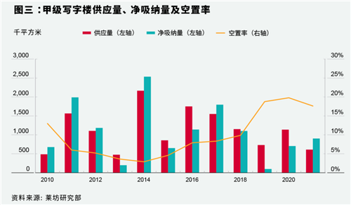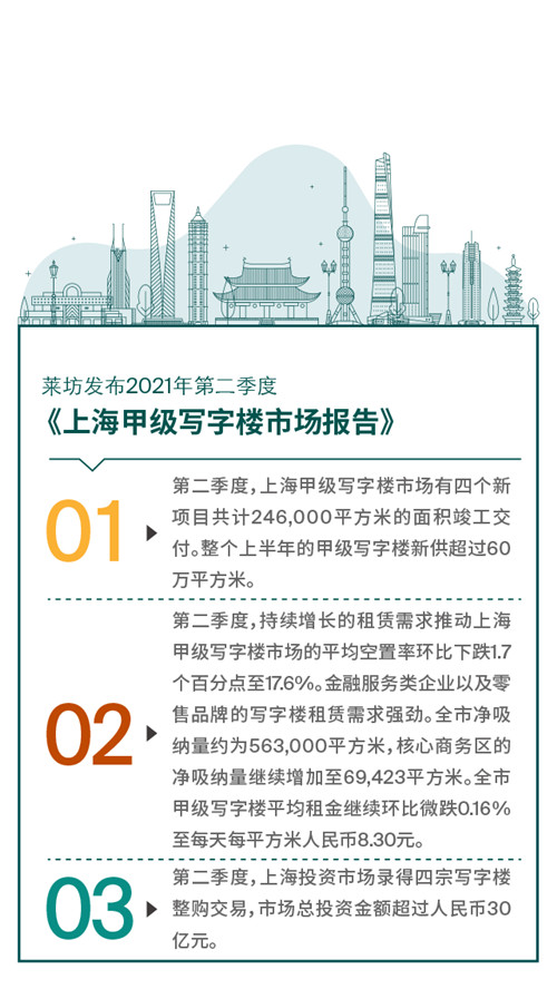 我們預(yù)計(jì)2021年下半年上海的甲級(jí)寫字樓市場(chǎng)將更為活躍,市場(chǎng)將有不少于100萬(wàn)平方米的寫字樓新項(xiàng)目入市,新項(xiàng)目主要集中在前灘及徐匯濱江區(qū)域。第三季度,隨著國(guó)內(nèi)經(jīng)濟(jì)的持續(xù)向好,租賃需求將進(jìn)一步得到釋放。在租賃雙方均趨于活躍的情況下,市場(chǎng)租金有望止跌回升,而市場(chǎng)空置率將繼續(xù)下降。