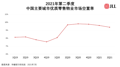 零售物業(yè)市場(chǎng)逐步走出疫情陰霾,全國(guó)優(yōu)質(zhì)零售物業(yè)空置率連續(xù)三個(gè)季度回落。伴隨中國(guó)疫苗接種率上升及疫情防控進(jìn)入常態(tài)化,零售消費(fèi)逐步恢復(fù)常態(tài),零售物業(yè)市場(chǎng)亦隨之迎來(lái)需求回暖。強(qiáng)線下渠道屬性的業(yè)態(tài),如餐飲業(yè)態(tài)恢復(fù)市場(chǎng)活力,餐廳客流出現(xiàn)明顯回升,新增需求逐步活躍?Х炔栾嬙谛乱惠喌馁Y本加持下,加速擴(kuò)張,品牌之間的競(jìng)爭(zhēng)加劇、客單價(jià)差距拉大,客群分層加速顯現(xiàn)。此外,新能源汽車、娛樂潮玩、健康生活類新興業(yè)態(tài)和品牌也展現(xiàn)出較強(qiáng)的承租能力。仲量聯(lián)行數(shù)據(jù)顯示,截至二季度末中國(guó)20個(gè)主要城市優(yōu)質(zhì)零售物業(yè)市場(chǎng)平均空置率錄得9.4%,按同口徑算環(huán)比下跌0.2個(gè)百分點(diǎn)。盡管新增供應(yīng)保持高位,但空置率環(huán)比已連續(xù)三個(gè)季度實(shí)現(xiàn)回落,顯示出市場(chǎng)回暖的良好跡象。然而,整體空置率仍高于疫情前水平。