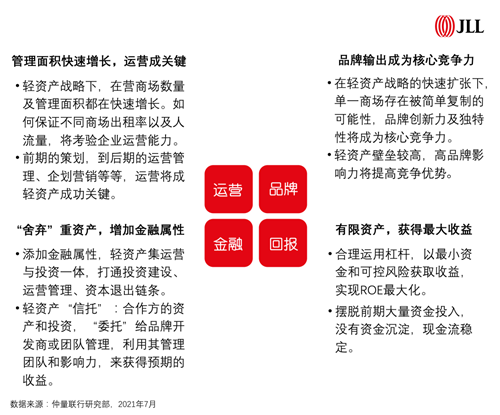 輕資產(chǎn)戰(zhàn)略下,運(yùn)營(yíng)商的在營(yíng)商場(chǎng)數(shù)量及管理面積快速增長(zhǎng)。從前策到后期運(yùn)營(yíng)管理、企劃營(yíng)銷等環(huán)節(jié),都是輕資產(chǎn)模式成功的關(guān)鍵。由于商業(yè)體或商業(yè)模式容易被簡(jiǎn)單復(fù)制,品牌創(chuàng)新力及獨(dú)特性將成為核心競(jìng)爭(zhēng)力之一。通過(guò)添加“金融屬性”,輕資產(chǎn)可以通過(guò)合理運(yùn)用杠桿,以最小的資金和可控的風(fēng)險(xiǎn)來(lái)實(shí)現(xiàn)最大化利益。