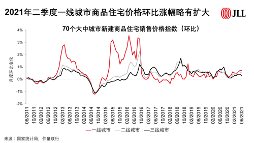 在價格方面,全國新建住宅市場價格整體較為平穩(wěn),二季度漲幅略有擴大。國家統(tǒng)計局發(fā)布70個大中城市商品住宅價格顯示,2021年4-6月份一線城市新建商品住宅累計漲幅2.0%,較一季度漲幅擴大0.5個百分點;二線城市新建商品住宅累計漲幅1.7%,較一季度擴大0.4個百分點;三線城市新建商品住宅累計漲幅1.1%,較一季度擴大0.3個百分點。一線城市二手房價格增速小幅回落,二季度累計漲幅2.1%,較一季度回落1.3個百分點。尤其是深圳自二手房成交指導價機制建立之后,二手房貸款受限,市場熱度明顯消退,二季度深圳二手房價格環(huán)比已由漲轉跌。