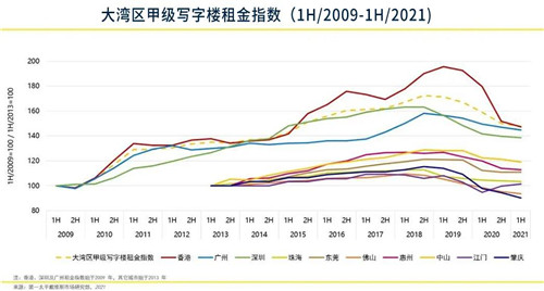 2021年上半年,大灣區(qū)甲級寫字樓租金指數(shù)環(huán)比下降1.6%至147.6,降幅環(huán)比收窄4.0個百分點(diǎn)。