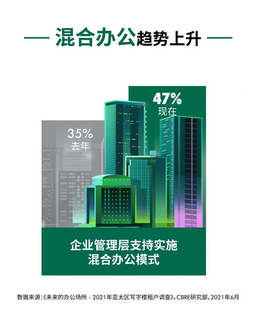 隨著經(jīng)濟復(fù)蘇步伐加快和疫苗接種率上升,企業(yè)租戶信心持續(xù)恢復(fù),眾多公司也在鼓勵員工回到辦公室工作并同時為其提供更靈活、多樣的辦公方式選擇。調(diào)查發(fā)現(xiàn),受訪企業(yè)希望在疫情得到完全控制后長期采用以員工在辦公室工作為主、在家辦公為輔的混合辦公模式。與此同時,企業(yè)機構(gòu)已經(jīng)開始根據(jù)實際需要制定遠程辦公政策及相關(guān)實施規(guī)范,給予管理人員決定員工日程安排以及批準遠程辦公的權(quán)限。