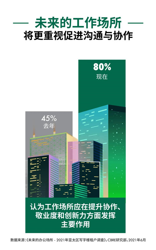針對“新常態(tài)”之下的寫字樓發(fā)展和企業(yè)租戶的應(yīng)對措施,CBRE世邦魏理仕于5月啟動了《未來的辦公場所——2021年亞太區(qū)寫字樓租戶調(diào)查》,并于近期發(fā)布調(diào)查結(jié)果,確立了“區(qū)域內(nèi)經(jīng)濟穩(wěn)步復(fù)蘇”、“企業(yè)不動產(chǎn)組合規(guī)模增長預(yù)期提高”、“混合辦公趨勢上升”、“未來的工作場所將更重視促進溝通與協(xié)作”、“企業(yè)將實施更具靈活性的工作場所設(shè)置”等五個主要的寫字樓趨勢。