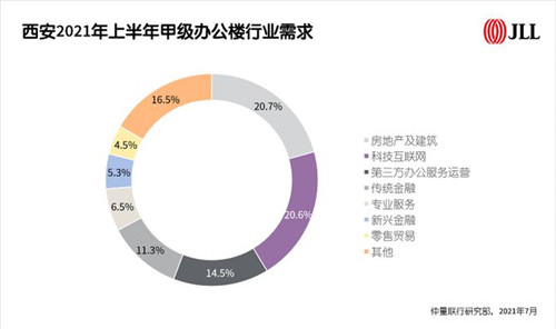 上半年,由于在線教育擴(kuò)張中斷,西安甲級(jí)辦公樓新成交的租賃需求較2020下半年有所回落。整體成交需求中,房地產(chǎn)及建筑行業(yè)以20.7%的占比居首。該行業(yè)能長(zhǎng)期作為西安辦公樓需求來(lái)源的基石,與西安經(jīng)濟(jì)結(jié)構(gòu)中房地產(chǎn)投資占GDP的比重常年維持在30%左右有密不可分的關(guān)系。且2021年正值西安迎接十四運(yùn)的關(guān)鍵之年,截至二季度末,已完工的重點(diǎn)建設(shè)項(xiàng)目達(dá)191個(gè),包括路橋隧道、文旅、市政和商業(yè)等多種類型,該類工程建設(shè)對(duì)于房地產(chǎn)及建筑行業(yè)的需求量貢獻(xiàn)較大。