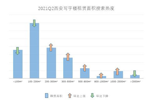 寫字樓租賃面積方面,據(jù)58同城、安居客數(shù)據(jù)顯示:2021年二季度100-200㎡小面積項目關(guān)注度最高,占比34.9%,較去年同期下降2.3%,300—500㎡中型面積項目搜索熱度持續(xù)上升,占比13%,較去年同期上升3.6%。西安市經(jīng)濟態(tài)勢穩(wěn)步恢復(fù),房地產(chǎn)投資占GDP的比重常年維持在30%,促使中小型辦公面積需求相應(yīng)抬頭。值得注意的是,超過2000㎡大型面積熱度略有下降, 或與在線教育行業(yè)受監(jiān)管影響有關(guān)。