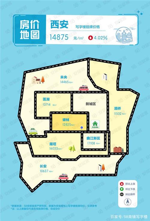 據(jù)58同城、安居客《2021年Q2寫字樓價格地圖》顯示,二季度西安寫字樓掛牌價格為14875元/㎡,環(huán)比上漲4.02%。分區(qū)域來看,曲江新區(qū)以17108元/㎡的掛牌價格排名靠前,雁塔區(qū)以16033元/㎡的水平排在其后。
