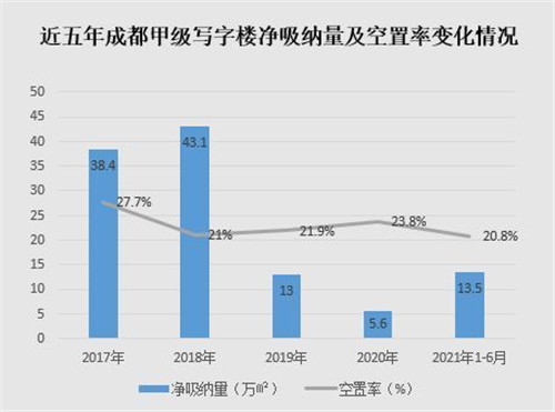 截至2021年上半年,成都甲級(jí)寫(xiě)字樓存量已超340萬(wàn)平方米。由于上半年新增供應(yīng)相對(duì)較少,全市整體空置率下降至20.8%。同時(shí),二季度租賃需求行業(yè)結(jié)構(gòu)繼續(xù)保持穩(wěn)定,新增需求仍集中于信息技術(shù)、金融、消費(fèi)者服務(wù)三大行業(yè)。整體來(lái)看,成都企業(yè)的活力和經(jīng)濟(jì)環(huán)境持續(xù)向好。