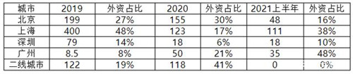 買家類型方面,在上半年的大宗交易中,投資型買家成交金額約582億元,占比提升至66%。筆者認為,疫情對投資型買家并未造成實質性影響,相反,疫情倒逼部分內(nèi)外資企業(yè)出售北京、上海等核心城市的優(yōu)質物業(yè),給了投資型買家更好的選擇和議價機會。外資投資的首選城市仍然為上海,今年上半年上海外資投資總額約111億元,占上?偨灰最~約38%,占全國外資投資額約52%。上半年廣州由于領展購入太陽新天地商業(yè)項目,外資占比提升至48%。