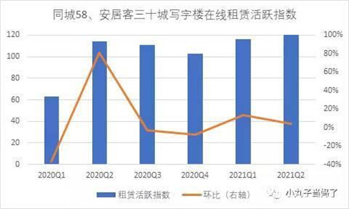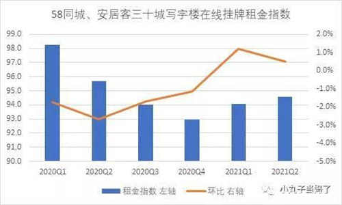 58同城、安居客商業(yè)地產(chǎn)在線搜索數(shù)據(jù)顯示,2021年一、二季度三十城寫字樓在線租賃活躍度指數(shù)持續(xù)向好,二季度該指數(shù)達到120.8,環(huán)比提升4%,同比提升6%,表明三十個重點城市寫字樓找房熱度高,商務氛圍活躍。與此同時,三十城寫字樓在線掛牌租金指數(shù)連續(xù)提升二個季度,截止二季度該指數(shù)為94.6,尚未恢復至疫情前水平。這反映出寫字樓租賃市場仍舊延續(xù)“以價換量”策略,市場需求企穩(wěn)向好。