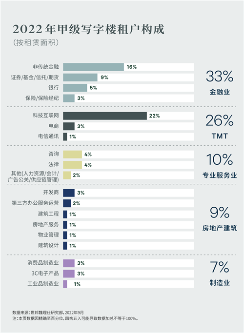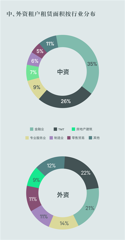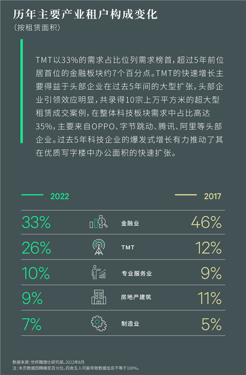 聚焦5,000平方米以上的特大型租戶,對比2017年以銀行、保險和證券為主的金融板塊為主的需求結(jié)構(gòu),受近年來頭部科技企業(yè)的快速擴張帶動,2022年科技板塊需求位列榜首,占比為31%,高于金融板塊4個百分點。