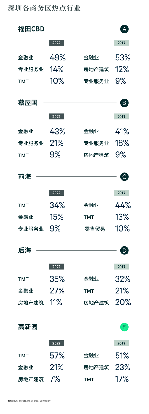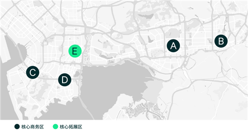 TMT和金融穩(wěn)居深圳主要商務(wù)片區(qū)需求榜的前兩席,其中TMT板塊需求增長迅猛,替代5年前部分片區(qū)位居第二位的專業(yè)服務(wù)及房地產(chǎn)建筑板塊的需求。TMT在各大商務(wù)片區(qū)中的需求比例均有顯著提升,且呈現(xiàn)出對于南山區(qū)明顯的市場偏好,主要原因在于高新園區(qū)、后海片區(qū)作為頭部科技總部所在地,吸引了眾多上下游企業(yè),從而形成了較為完整的科技生態(tài)圈,不斷帶動科技企業(yè)的聚集。而金融行業(yè)需求則橫跨多個商務(wù)片區(qū),福田和南山區(qū)均納入選址考慮范圍,從前海、后海和高新園區(qū)來看,金融業(yè)板塊均為第二大需求來源。此外,專業(yè)服務(wù)業(yè)和房地產(chǎn)建筑作為第三位需求來源,則因片區(qū)分布而有差異。專業(yè)服務(wù)業(yè)需求主要分布在原本占比較高的福田CBD和蔡屋圍兩大片區(qū),以及相應(yīng)產(chǎn)業(yè)政策引導(dǎo)下的前海片區(qū),其中福田CBD更是聚集了全市近一半的專業(yè)服務(wù)業(yè)需求,三大商務(wù)片區(qū)中均監(jiān)測到3個百分點以上的需求提升。而房地產(chǎn)建筑需求則主要分布在近年來房地產(chǎn)項目新增供應(yīng)較多的高新園和后海片區(qū),近項目擇址偏好明顯。但受房地產(chǎn)行業(yè)政策調(diào)控的影響,在兩大商務(wù)片區(qū)的需求比例對比5年前均有約10個百分點的減少。