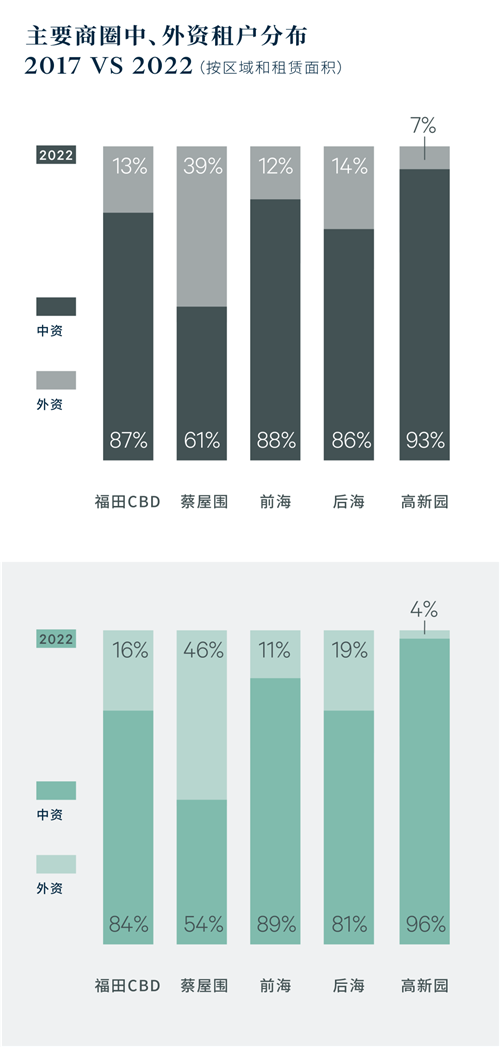 對比2022年與2017年的租戶普查結(jié)果,深圳甲級寫字樓市場前兩大需求行業(yè)來源保持不變 ,其中TMT需求在過去五年擴張最為明顯,同比上升超14個百分點,呈翻倍增長。排名前五的行業(yè)面積占比提升2個百分點,除科技和金融以外,制造業(yè)提升2個百分點,房地產(chǎn)減少2個百分點。