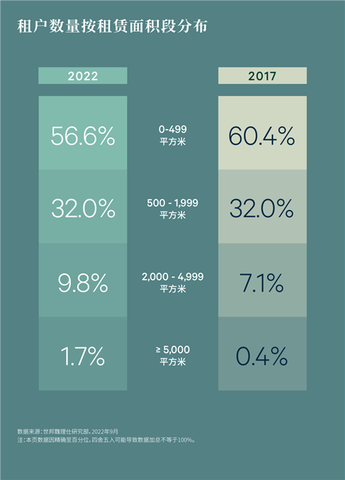 對比2022年和2017年不同面積段租戶數(shù)量占比,可以發(fā)現(xiàn),中小型租戶比例下降較為明顯,500平方米以下的小型租戶占比相較5年前下降3.9個百分點。而2,000平方米以上的中大型租戶和5,000平米以上的特大型租戶占比5年間則分別上升2.7和1.3個百分點,其中5,000平方米以上的特大型租戶數(shù)量從2017年僅有15家躍升到2020年的75家,同比增長高達4倍。