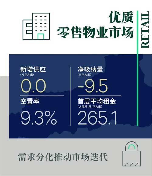 由于部分核心區(qū)域百貨項(xiàng)目出現(xiàn)大面積退租,疊加品牌擴(kuò)張需求疲軟,全市凈吸納量錄得負(fù)值。相應(yīng)地,市場(chǎng)整體空置率環(huán)比上升0.5個(gè)百分點(diǎn)至9.3%;購(gòu)物中心首層平均租金延續(xù)下行趨勢(shì),環(huán)比下跌0.8%。