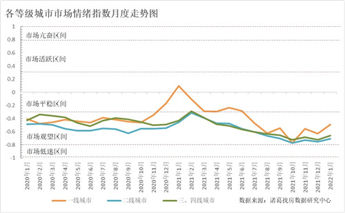 《報(bào)告》顯示,自2018年下半年起,隨著政策的收緊,全國市場情緒指數(shù)進(jìn)入從平穩(wěn)區(qū)間進(jìn)入觀望區(qū)間,隨后全國情緒指數(shù)一直處于觀望區(qū)間,至2021年10月觸底。10月起,中央頻頻釋放政策暖風(fēng),市場觀望情緒有所好轉(zhuǎn),2022年1月市場情緒指數(shù)較12月再次回升,為-0.68,接近于市場情緒指數(shù)的觀望區(qū)間的高位。