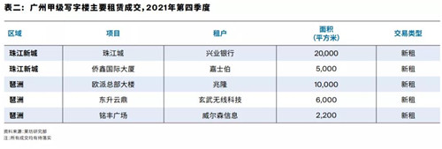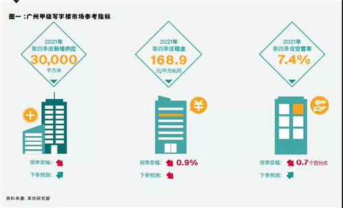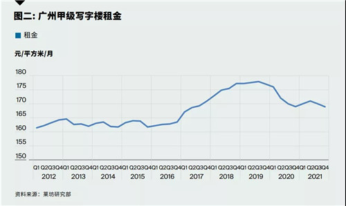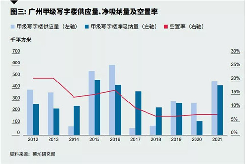 據(jù)萊坊發(fā)布的2021年第四季度廣州甲級寫字樓市場報告,第四季度廣州甲級寫字樓租賃市場繼續(xù)保持上一季度活躍態(tài)勢,全市空置率維持低位,環(huán)比下降0.7%至7.4%。租金方面,全市租金環(huán)比微降0.9%,下探至人民幣168.9元每月每平方米。2021年全年,廣州甲級寫字樓凈吸納量創(chuàng)五年新高,超過去兩年總和,達46萬平方米。