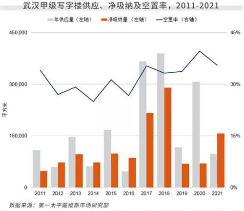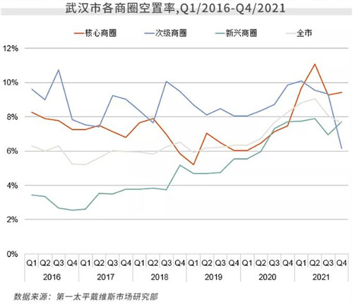 據(jù)第一太平戴維斯近日發(fā)布的武漢商業(yè)地產(chǎn)市場報告,第四季度在線教育行業(yè)退租潮持續(xù)發(fā)酵,武漢寫字樓市場凈吸納量季內(nèi)環(huán)比銳減40.5%,但全年需求較2020年明顯回升;空置率徘徊高位使租金仍處于下行通道。零售市場新增項目入市推動非核心區(qū)商業(yè)活力提升,餐飲、休閑業(yè)態(tài)表現(xiàn)優(yōu)秀,助推購物中心社交體驗。