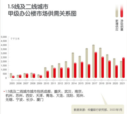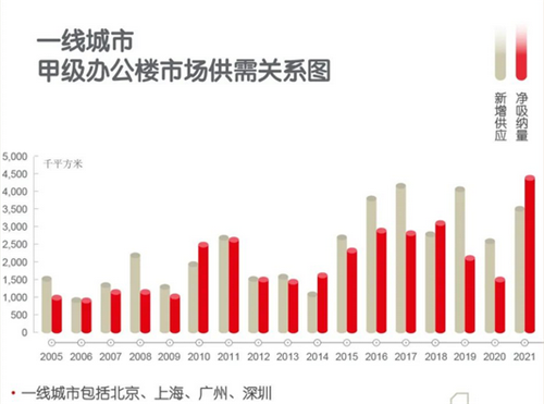 在經(jīng)濟(jì)回暖的支持下,2021年成為了中國(guó)辦公樓市場(chǎng)有史以來(lái)需求增量最為強(qiáng)勁的年份之一,全年多個(gè)城市的凈吸納量突破了歷史新高。全年主要城市的凈吸納量達(dá)到660萬(wàn)平方米。