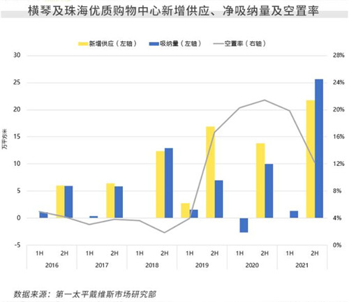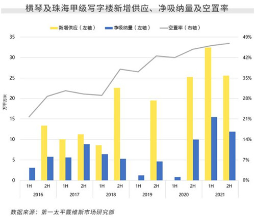 2021年,橫琴及珠海寫字樓市場新增供應(yīng)達(dá)歷史最高,推動總存量同比擴(kuò)張35.3%。同期,租賃市場表現(xiàn)活躍,全市年度凈吸納量達(dá)27.4萬平方米,為歷年最高。盡管如此,但受大量新增供應(yīng)的影響,兩市場平均空置率仍環(huán)比上升0.8個百分點、同比上升2.1個百分點,至46.9%。