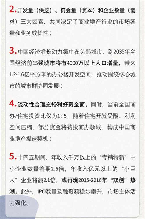 第四,政策發(fā)力強化多元市場主體均衡發(fā)展,創(chuàng)新型中小企業(yè)將大量涌現,同時,IPO及融資規(guī)模持續(xù)擴張,將為商業(yè)地產市場催化更多需求量和增長機會。