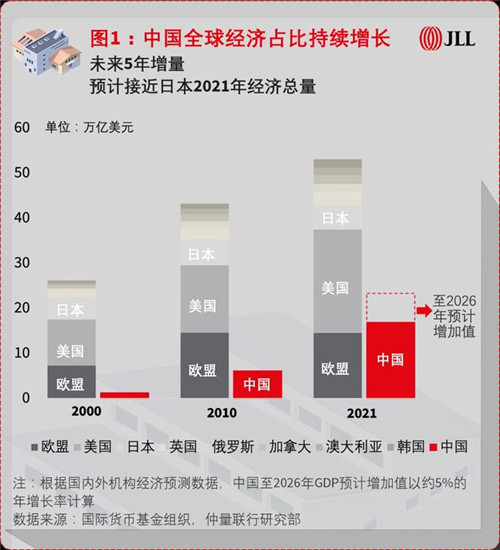 2021年中國經濟總量達到114.4萬億元人民幣,連續(xù)第二年超百萬億量級,占全球經濟比重超過18%,構成全球重要的增長引擎。與此同時,2021年中國GDP增速為8.1%,兩年平均5.1%,仍明顯低于疫情前2019年6.0%的經濟增長率。因此,我們應看到中國經濟形勢的一體兩面——一方面,中國經濟持續(xù)恢復,引領世界經濟回暖步伐,未來5年的經濟增量或將接近日本當前GDP總量(如圖1);同時,中國經濟增速放緩,實體經濟維持相對低位運行。