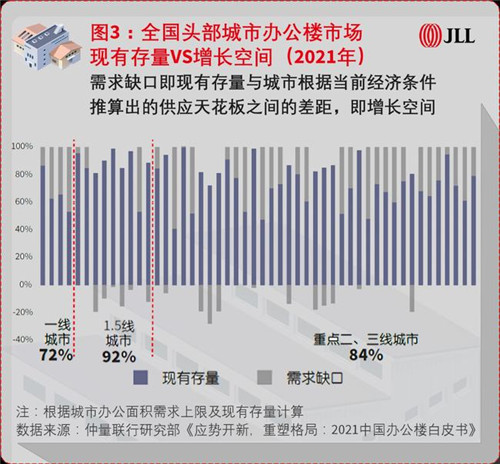 根據當前的經濟人口格局,中國辦公樓的開發(fā)增量空間將集中在核心城市,其中一線城市現有辦公樓市場存量僅為其潛在理論上限的72%,北京、廣州、深圳三市有接近翻倍的增長空間。但是,部分二三線城市已接近上限。全國經濟前50城中已有17個城市處于“供應過!眳^(qū)間,即現有市場存量已超過當前經濟水平的理論上限值,在一定程度上透支了未來的增長空間。更多數據和分析請參閱仲量聯行發(fā)布的《應勢開新,重塑格局:2021中國辦公樓白皮書》。